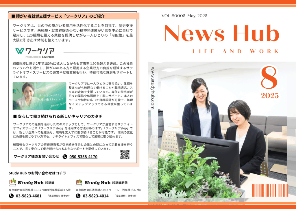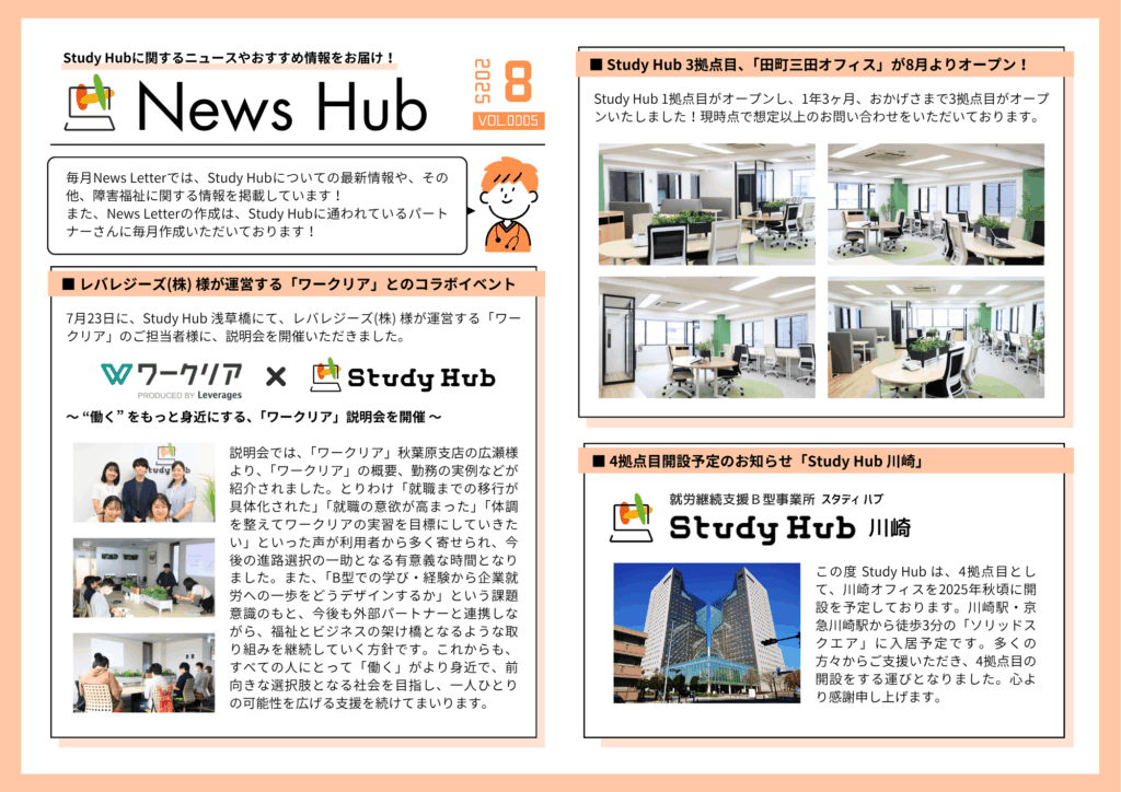 8月号では、先月行われた、「ワークリアとのコラボイベント」について、Study Hub3拠点目「田町三田オフィス」について、4拠点目としてオープンする「Study Hub 川崎」について紹介しています。