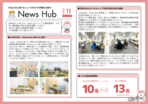 11月号では、12月1日よりオープンする「Study Hub 川崎」に関する情報、Study Hub 浅草橋で行われた「障害のある方へのキャリア支援 啓発交流会を開催」の開催報告、就職実績速報などについて紹介しています。